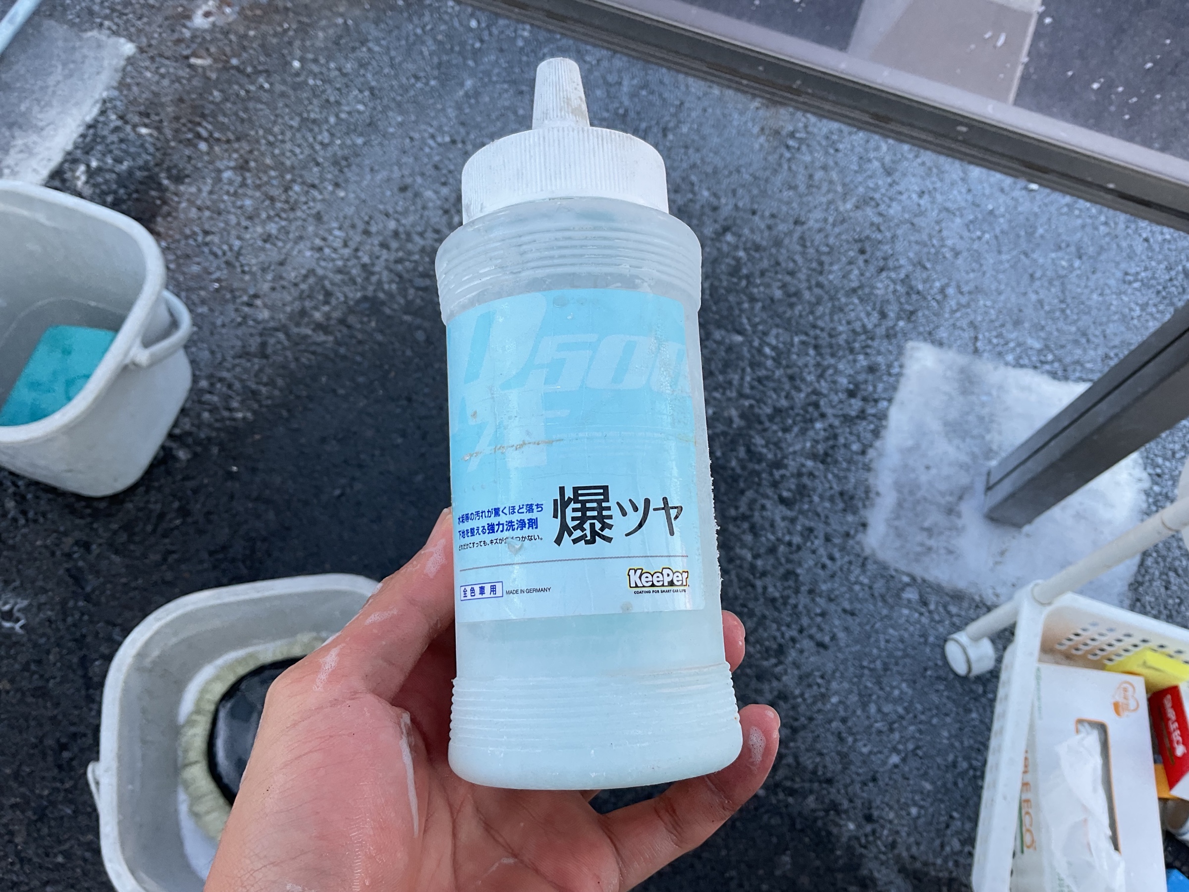 爆ツヤというケミカルを使って、汚れ落としを行います。