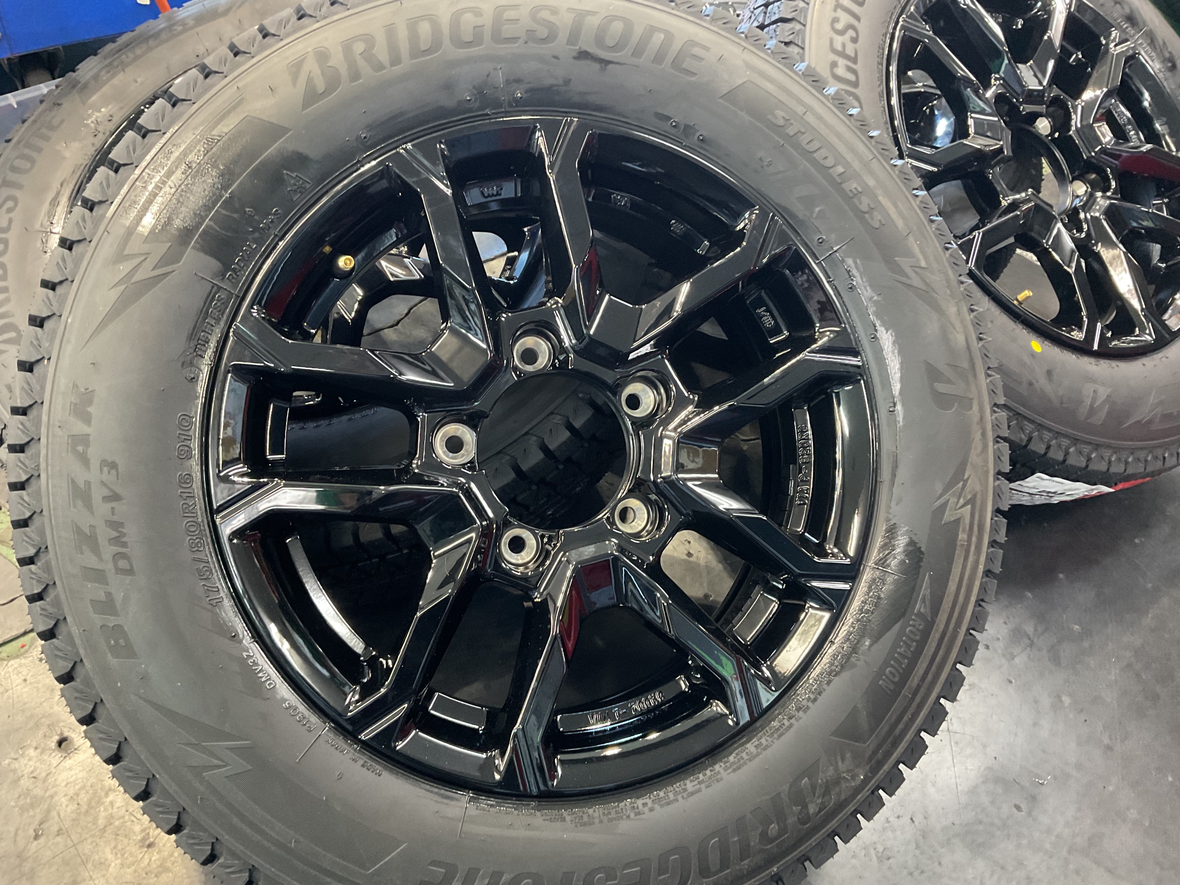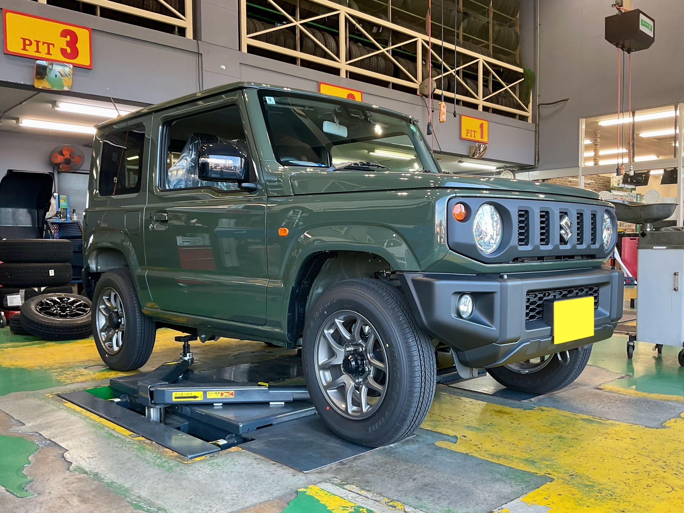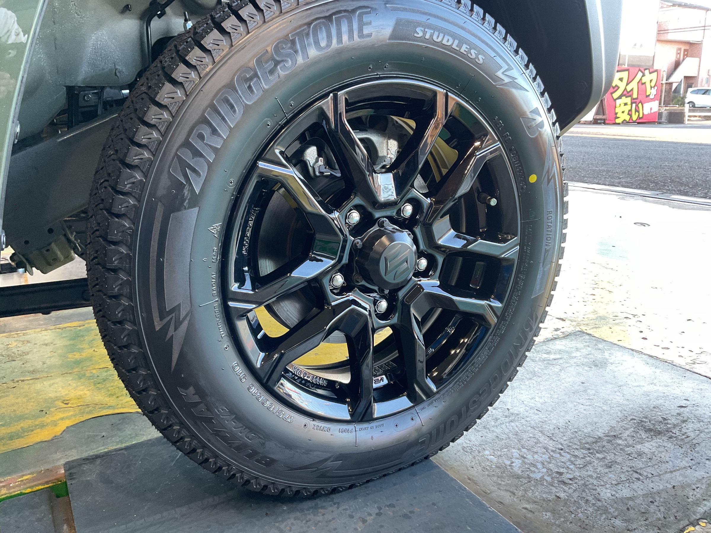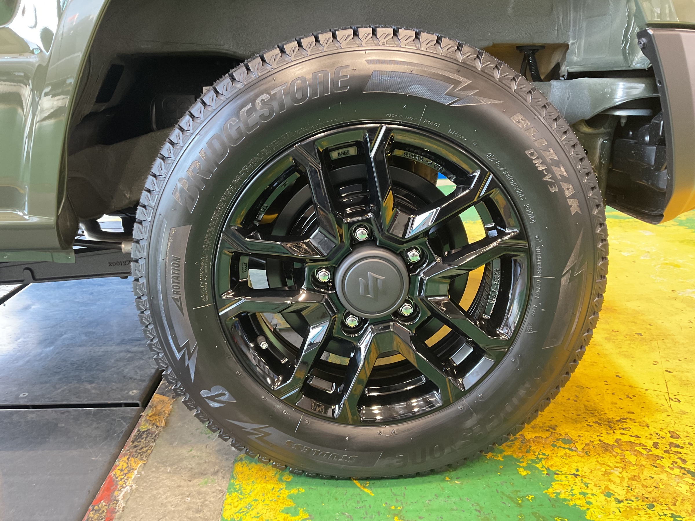 ジャングルグリーンにグロッシーブラックで冬タイヤもカッコよく!ジムニーにスタッドレスタイヤ取り付けです!
