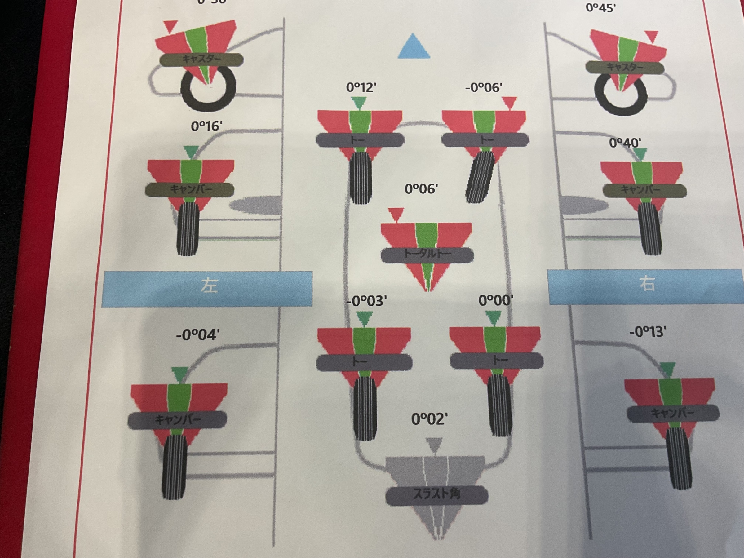 キャスターブッシュを補正パーツに変えれば数値を純正に近づけることも可能です。