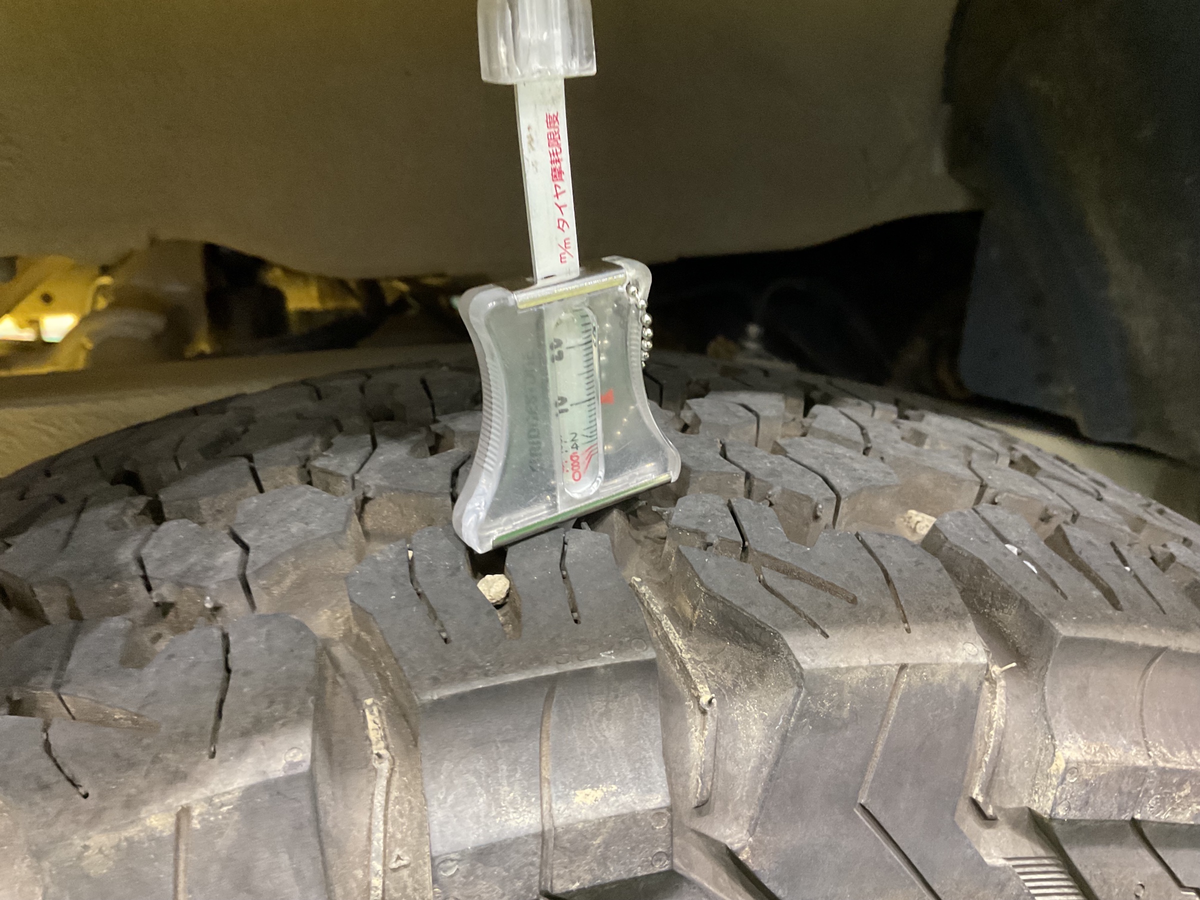 タイヤの空気圧を見させていただき、その後測定する機械を使って残溝をチェックします。また、外傷や異常な摩耗がないかもチェックします。