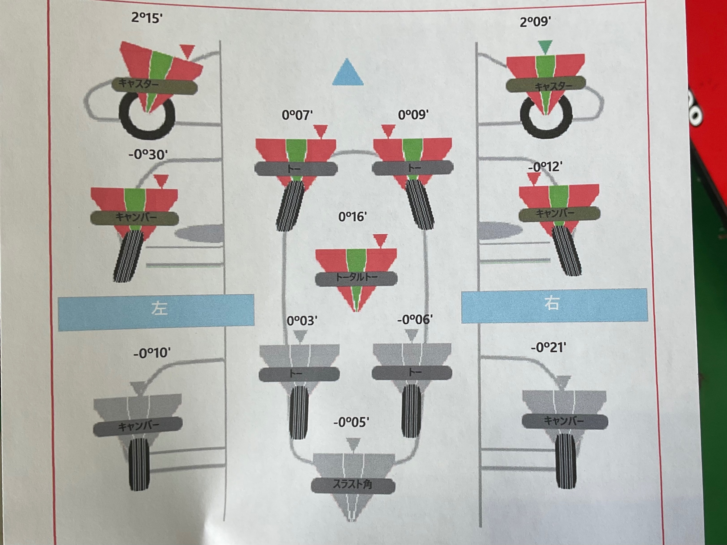 調整後は左のキャンバーの数値が綺麗に治せませんでしたが、摩耗に最も影響を与えるトーを優先して合わせることで、影響が1番少なくなるように調整させていただきました。