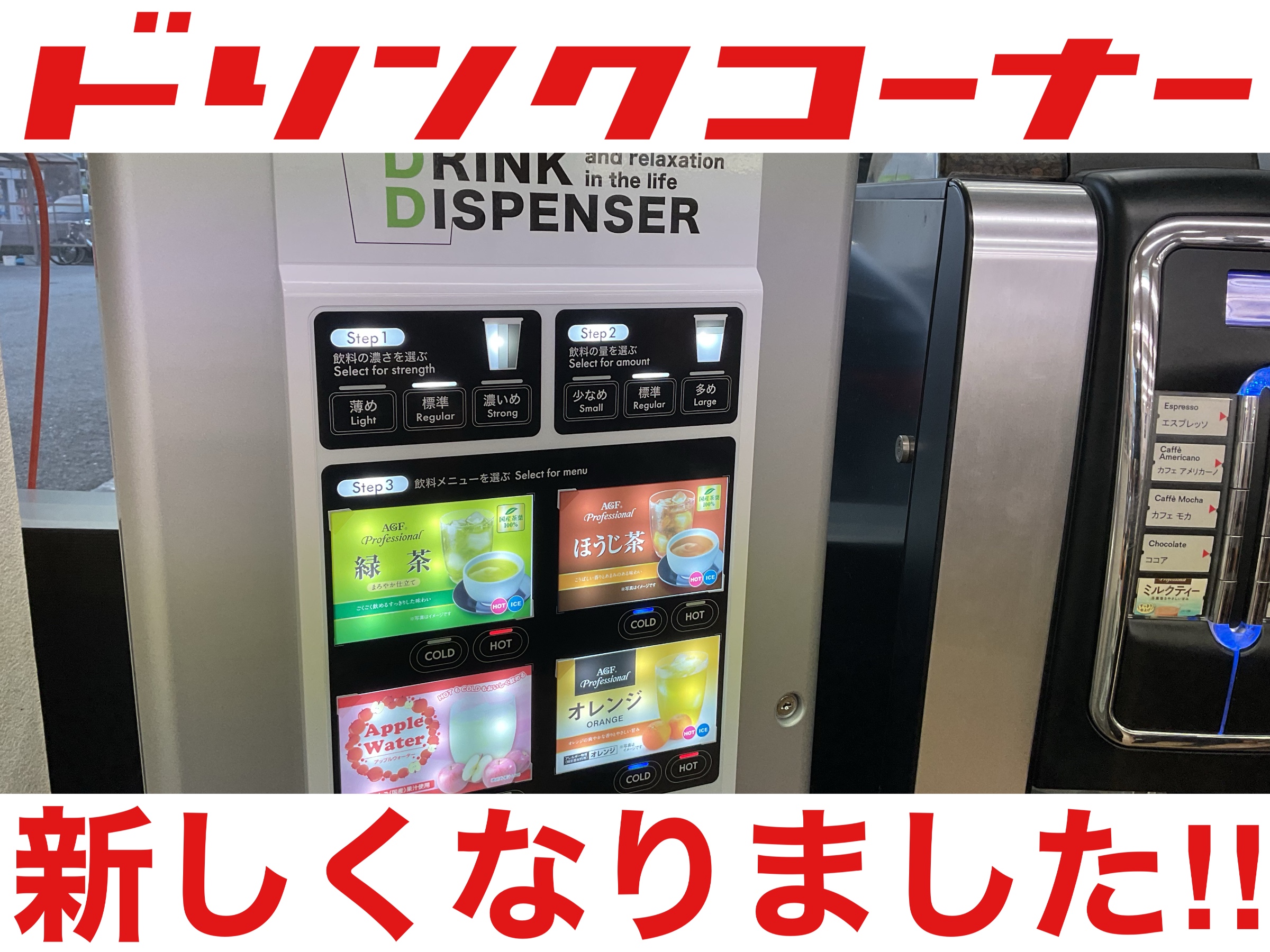 ドリンクコーナーが新しくなりました‼︎ ポスト 2025年9月26日 皆さんこんにちは!タイヤ館川口店です。 お客様からご好評いただいておりました、ドリンクコーナーの機械が新しくなりました。 3種類だった飲み物が4種類に進化しました‼︎ ご好評のオレンジジュースに加え… アップルジュース導入です‼︎ 濃さも選べます。 濃いめ、多めがオススメです。かためは選択できませんが笑 スタッフも試飲してみましたが、濃くて美味しいですね! 作業の待ち時間に是非お飲みください。 スタッフのおすすめは濃いめのアップルジュースです。 ふじりんご果汁使用で、濃いのにスッキリと飲みやすいです。 これまで飲んだアップルジュースの中でも断トツの美味しさでした。 タイヤ館川口店でした。 タイヤ館 川口 住所:336-0015埼玉県さいたま市南区太田窪3515-6 電話番号: 048-887-6833 相談予約 カテゴリ:その他
