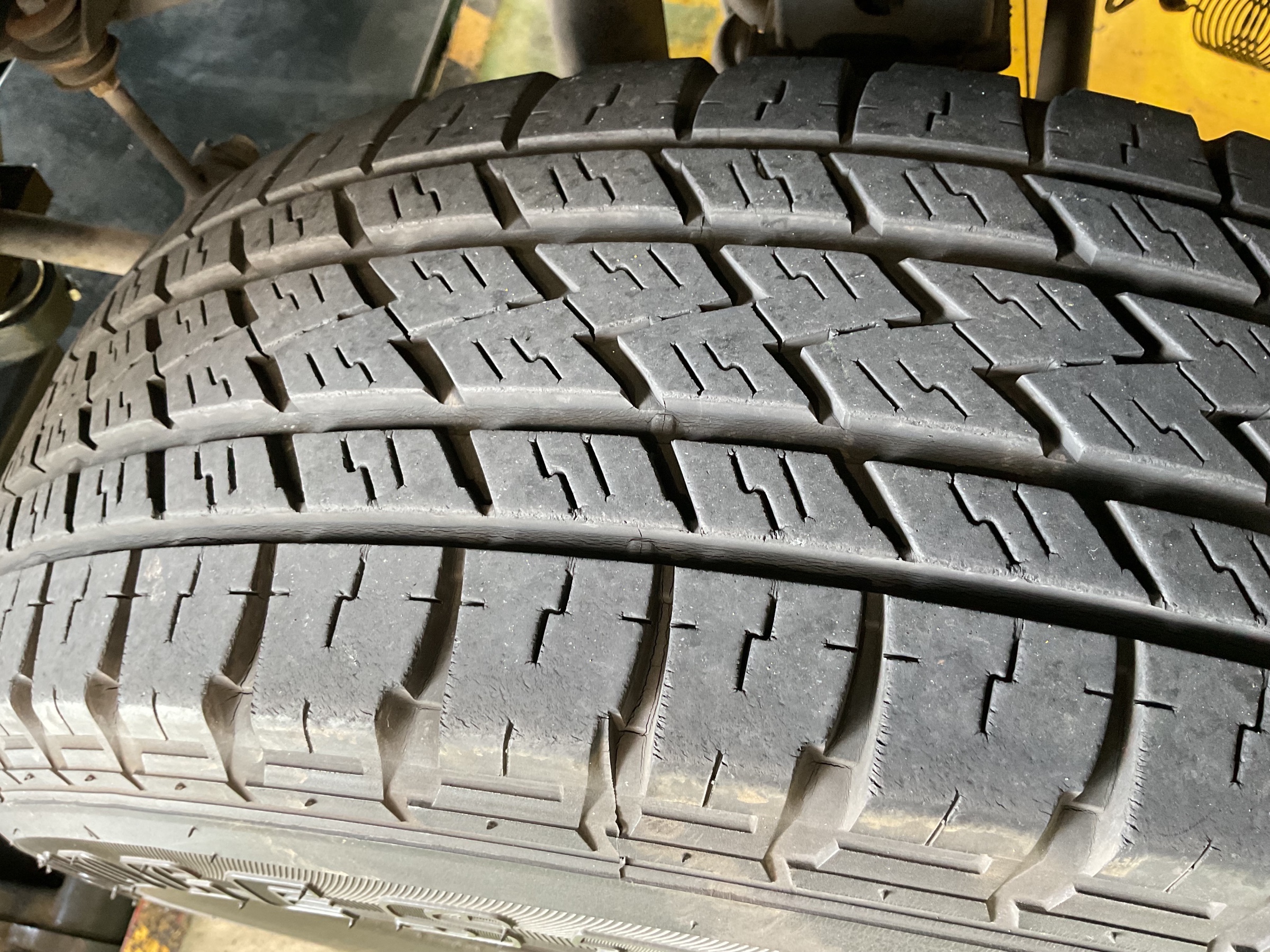 最後にタイヤのすり減り方を点検します。空気圧や、タイヤの取付角度が適性でないと偏ってすり減る(偏摩耗)場合があります。タイヤ寿命が短くなり、振動・騒音の発生原因となります。