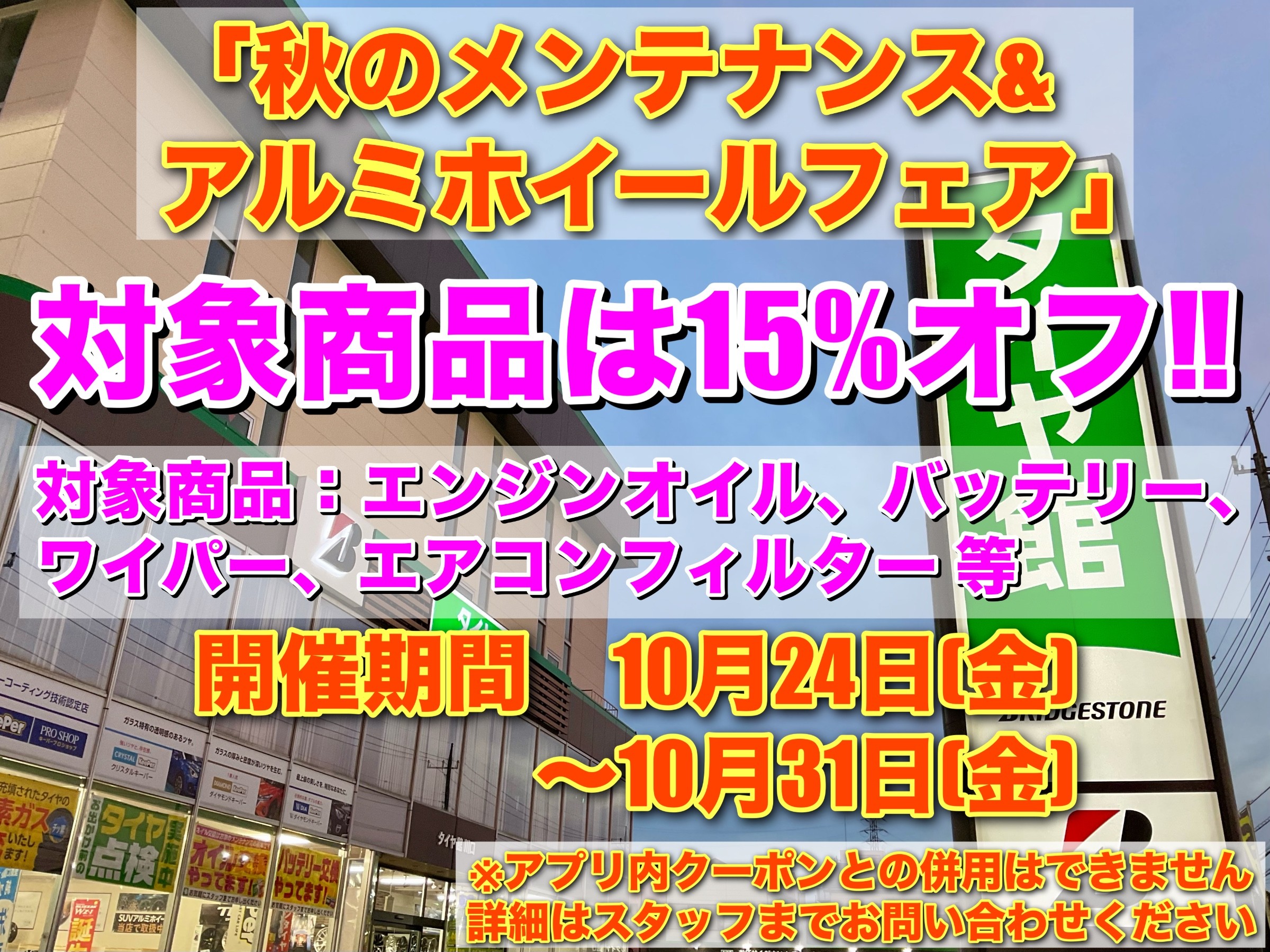 10月24日(金)〜10月31日(金)までの1週間、「秋のメンテナンス&軽自動車アルミホイールフェア♪」開催いたします。