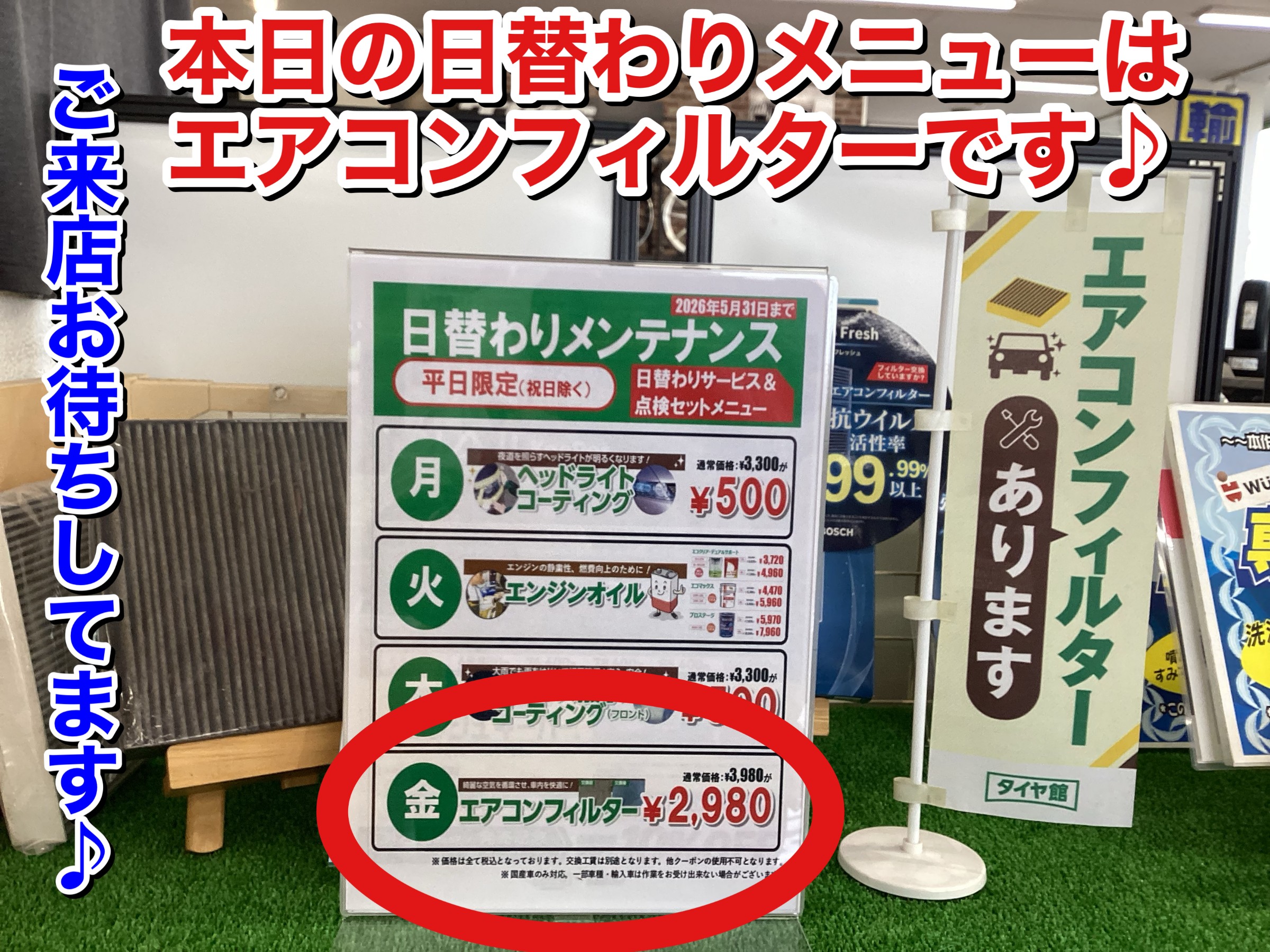 なんと!エアコンフィルターが通常¥3,980(税込)が¥1,000OFFの¥2,980(税込)(交換工賃別途)