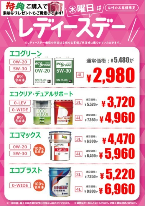 【毎週木曜日は!】お得にオイル交換が出来ちゃいます(^^)/ レディースデーです!