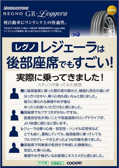 REGNO レジェーラ 軽自動車でも快適空間 ポスト 2016年4月5日 こんにちは。タイヤ館川口店の吉澤です!もうご存知のとおりブリヂストンから軽自動車専用の快適、そして長持ちするREGNO レジェーラが新登場いたしました。非常に静かで乗り心地も良く、走行中も快適な空間でドライブもより楽しくお出掛けして頂けるタイヤですので是非GWのお出掛けの前に履いてみてはいかがですか?スタッフ一同お待ちしております。 担当:吉澤