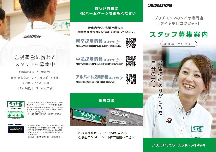 ☆スタッフ募集☆ ポスト 2020年2月20日 当店では元気で明るいスタッフを大募集しておりま~す! 車好きなら大歓迎!! ブリヂストングループのタイヤ館で一緒に働きませんか? 初心者でも丁寧に指導します! 詳しくはお電話下さい 048-887-6833 担当 薄井まで 関連情報もあわせてご覧ください 中途採用情報はこちら ↓ ↓ ↓ カテゴリ:お知らせ
