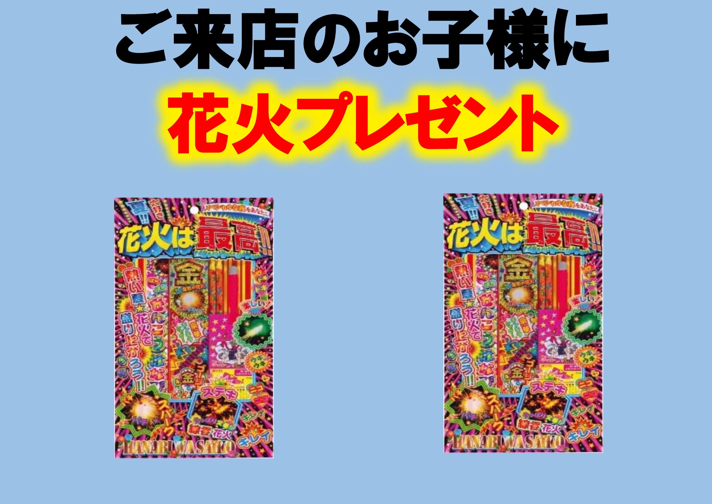 ご来店のお子様に花火もプレゼント中です!