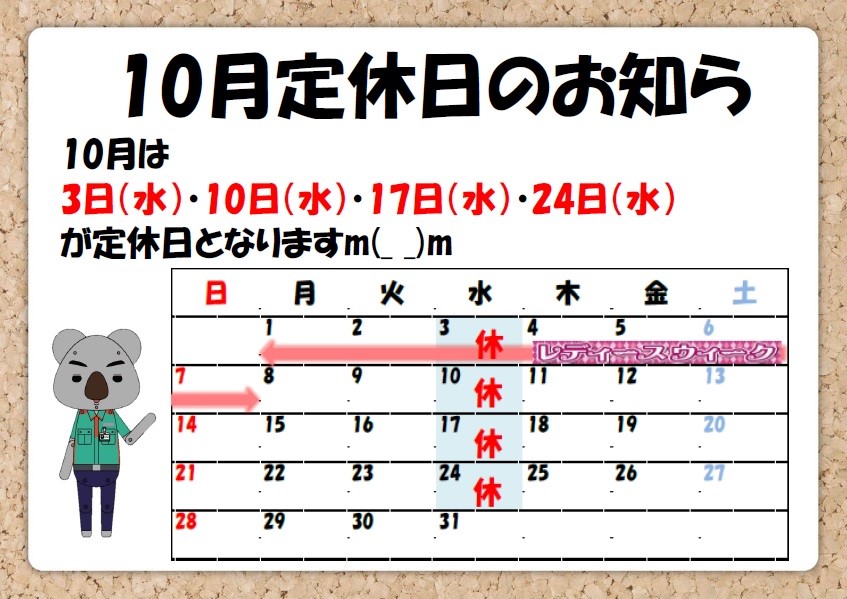 10月の定休日をお知らせいたします( ´ ▽ ` )ノ