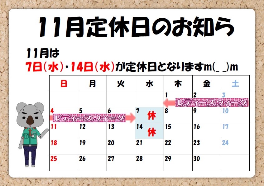 11月定休日♪ ポスト 2018年10月31日 皆様こんにちは! タイヤ館川口店 スタッフの疋野です^^ 11月の定休日を更新いたしましたので ご来店の際にご活用いただければ幸いです★ 定休日:7日(水)、14日(水) レディースウィーク:1~6日(7日は定休日ですので(´;ω;`)) レディースデー:毎週火曜・木曜 皆様のご来店、スタッフ一同、心よりお待ちしております♪ 担当:疋野