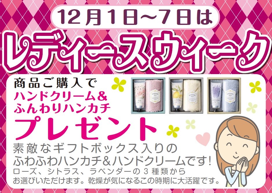 ★レディースウィーク★ ポスト 2018年12月1日 皆様こんにちは! タイヤ館川口店 スタッフの疋野です^^ \\毎月1日~7日はレディースウィーク// 商品ご購入の女性のお客様限定イベント! 今月はハンドクリーム&ハンカチをプレゼントしちゃいます♪ 感想が気になる季節ですよね。 手を洗ったらしっかり水分をふき取り、 ハンドクリームで保湿しましょう(*^▽^*) 皆様のご来店、スタッフ一同、心よりお待ちしております♪ 担当:疋野