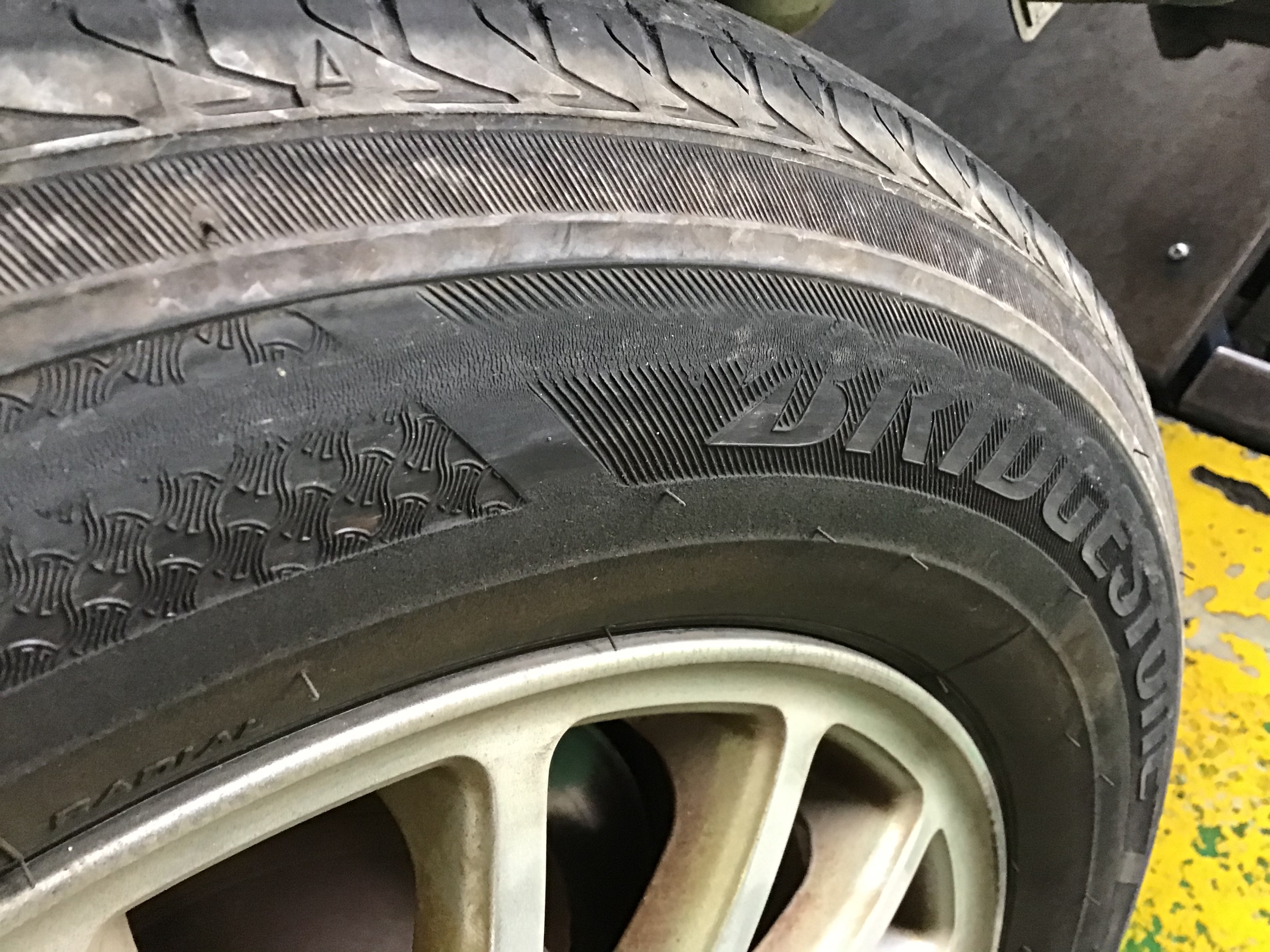 タイヤ側面にある「BRIDGESTONE」という字の上部が何かで擦られたかのように消えかかっているのがわかります。