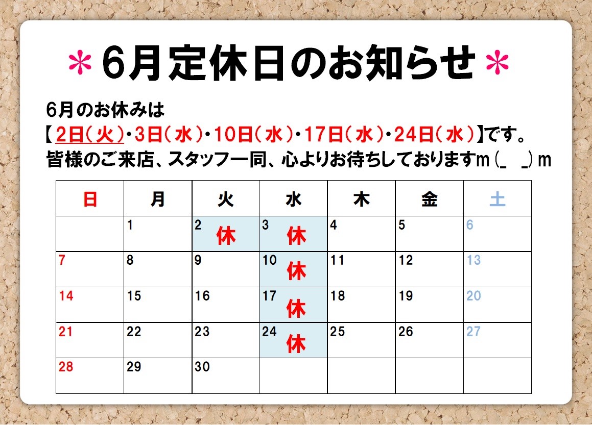 6月定休日のご案内 ポスト 2020年5月29日 皆様こんにちは! タイヤ館川口店 スタッフの疋野です^^ 6月の定休日のご案内です!! 2日、3日、10日、17日、24日がお休みとなります。 ※2日は火曜日ですがお休みとなります。 ご迷惑をおかけしますがご理解のほどよろしくお願いいたします。 ご来店の参考までに★ 皆様のご来店、スタッフ一同、心よりお待ちしております♪ 担当:疋野