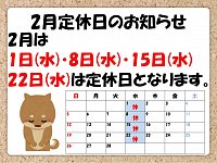 こんにちは。 タイヤ館川口店です。 いつも当店のホームページをご覧いただきありがとうございます。 2 月定休日のお知らせです。 2月は1日(水)、8日(水)、15日(水)、22日(水)が 定休日となります。 何卒ご理解いただきます様お願い致します。 今後もコロナウイルス感染対策として従業員のマ...