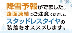 1月23日(月)埼玉県で雪または雨の天気予報が 発表されています!!「気象庁HPより」 当日降雪がなくても、雨による路面の凍結する事も! 車の運転には、十分注意が必要です(*_*; スタッドレスタイヤのご用意がまだの方、 万が一の積雪・路面凍結に備え、準備しましょう(^_-)-☆ タイヤ館川口で...