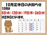 こんにちは。 タイヤ館川口店です。 いつも当店のホームページをご覧いただきありがとうございます。 10月定休日のお知らせです。 10月は5日(水)・12日(水)・19日(木)・26日(水)が 定休日となります。 ご迷惑をお掛けいたしますが、何卒ご理解いただきます様お願い致します。 今後もコロナウ...