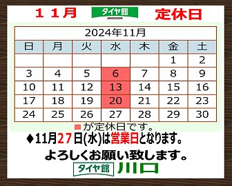 皆様こんにちは! いつもタイヤ館川口をご利用いただきありがとうございます★ 11月定休日のお知らせです! 11月は6日(水)・13日(水)・20日(水)をお休みとさせて頂きます。 また、27日(水)は営業させて頂きますので よろしくお願い致します。 皆様のご来店お待ちしております。