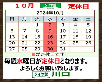 皆様こんにちは! いつもタイヤ館川口をご利用いただきありがとうございます★ 10月定休日のお知らせです! 10月は2日(水)・9日(水)・16日(水)・23日(水)・30日(水)を お休みとさせて頂きます。