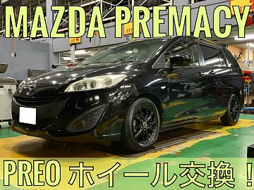 皆さんこんにちは!タイヤ館川口店です。 本日紹介させていただく作業はこちら! マツダプレマシーのホイール&タイヤ交換作業です! ご購入いただいたホイールはブリヂストンが誇る人気のホイール、PREOです。 こちらが装着前。 装着後です! カラーはブラックでシックに決まりました! 一緒にタイ...