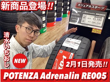 こんにちは! タイヤ館川口のホームページをご覧いただきありがとうございます。 今回ご案内するタイヤは2月1日発売の【ポテンザ アドレナリン RE005】です! スタッフの清水も興味津々で、僕の車にも装着してみたいと!いちおし商品となってます(^^)/ ★是非店頭にてチェックしてみてくださいね★