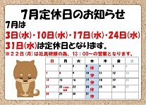 皆様こんにちは! いつもタイヤ館川口をご利用いただきありがとうございます★ 7月定休日のお知らせです! 7月は3日(水)・10日(水)・17日(木)・24日(水)・31日(水)を お休みとさせて頂きます。 また22日(月)は社員研修の為、13:00~の営業となります。 何卒ご理解頂きますようお願い致します。