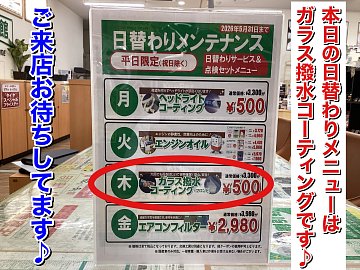 タイヤ館川口のホームページをご覧いただきありがとうございます! 平日限定日替わりメンテナンスのご案内です(^^)/ なんと!ガラス撥水コーティングが通常¥3,300(税込)のところ、¥2,800 OFFの¥500(税込)です! 木曜日限定メニューになります!! お客様のご来店お待ちしております!(^^)!