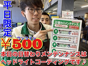 タイヤ館川口のホームページをご覧いただきありがとうございます。 平日限定で日替わりメンテナンスを実施中です!! 本日は、ワンコイン(¥500)でヘッドライトコーティングができます!(^^)!