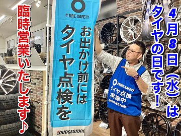 【臨時営業します】本日、4月8日(水)は【タイヤの日】です(^^)/ 愛車のタイヤ点検はプロにお任せください‼
