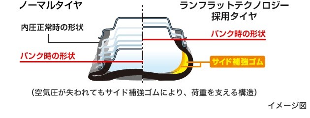 パンク時に空気圧を失った際、サイド補強ゴムにより荷重を支える仕組みです。