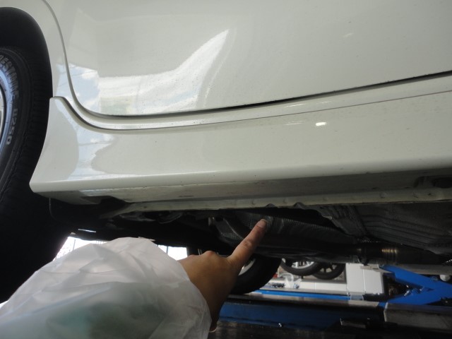 後輪タイヤのやや前側の同じく凹んでいるところ。