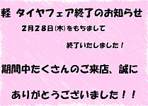 みなさん、こんにちは! いつもHPをご覧頂き、ありがとうございます^^ 只今開催中の【軽タイヤフェア】残り4日となりました!! 川之江の地域では軽自動車をお乗りのお客様が多いですよね! 2月は軽自動車タイヤがお得となっております☆彡 ●タイヤの溝が少なくなっている方 ●ヒビ割れが気になる...
