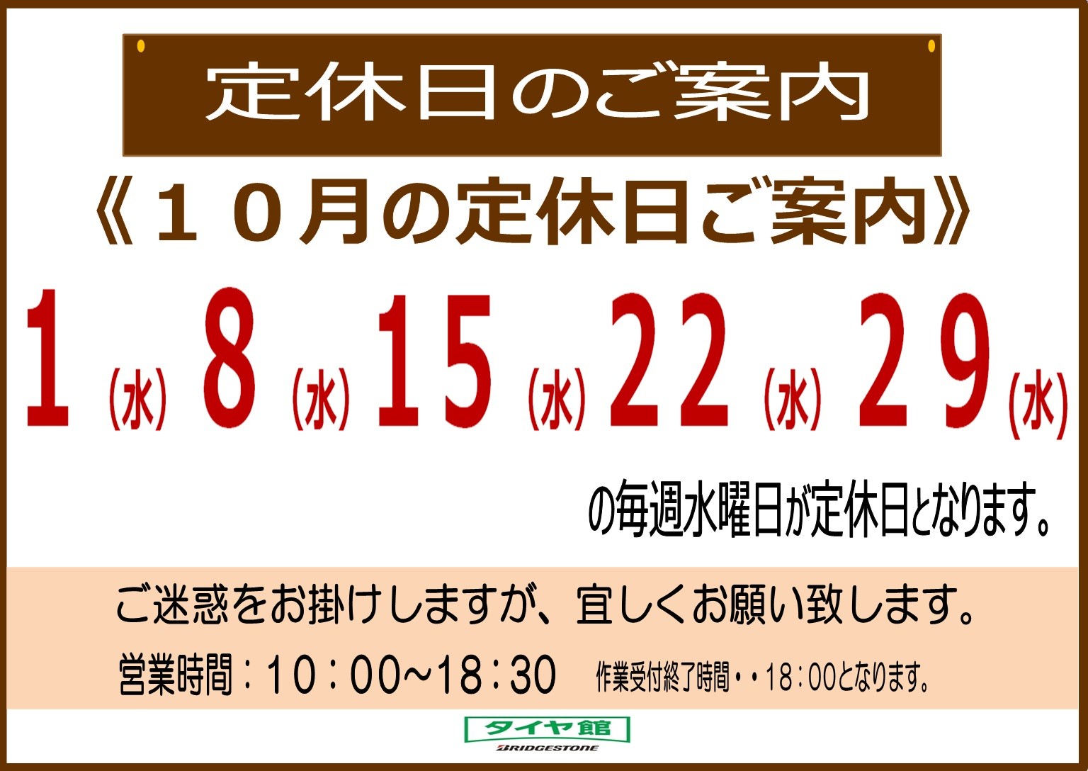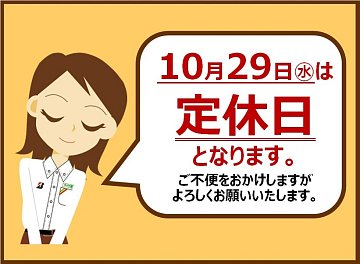 【お知らせ】10月29日は定休日です。