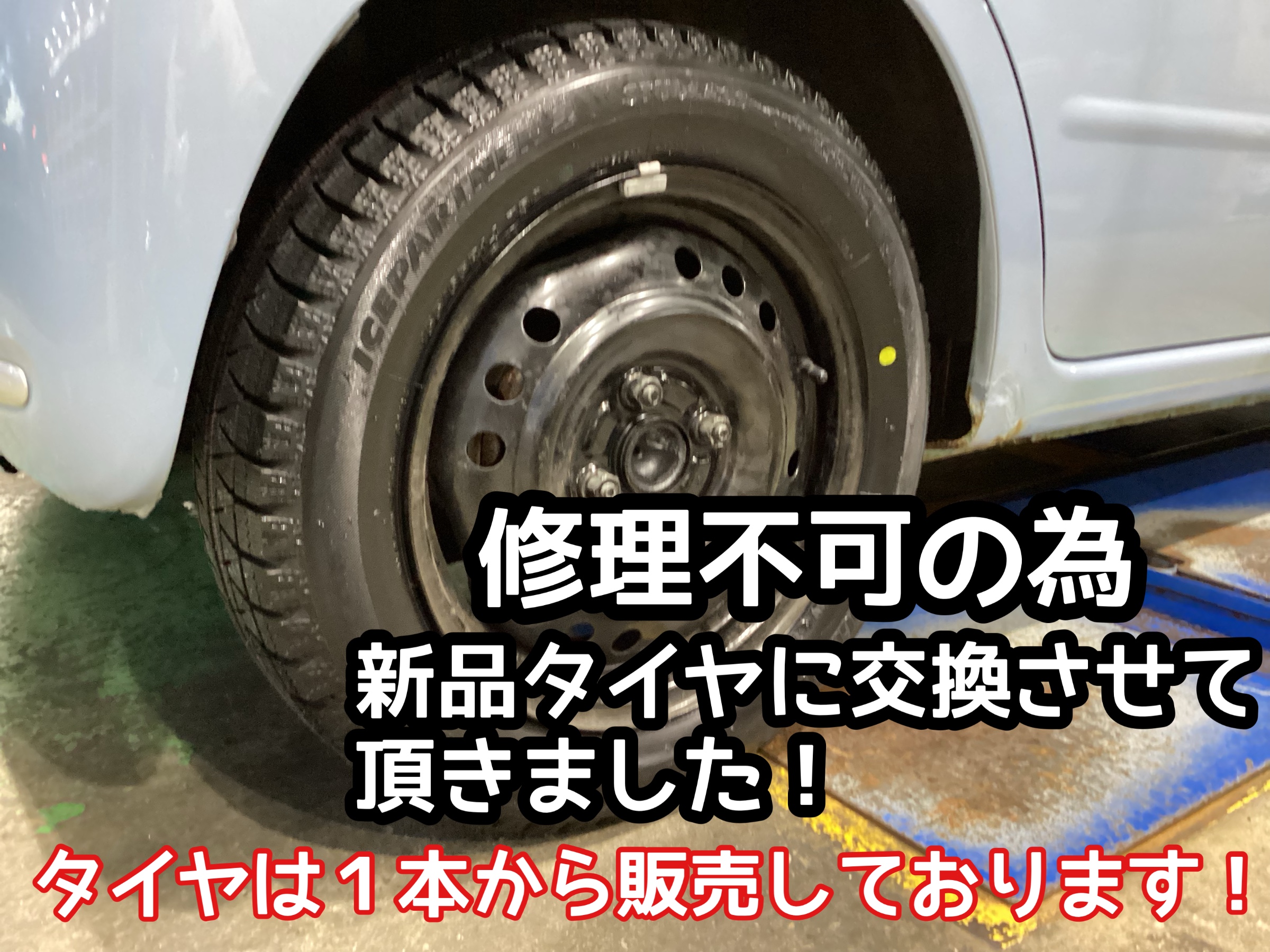 新品タイヤに交換での対応となります。