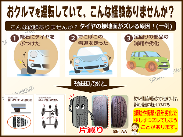 タイヤの偏摩耗(片減りなど)の予防はもちろん、