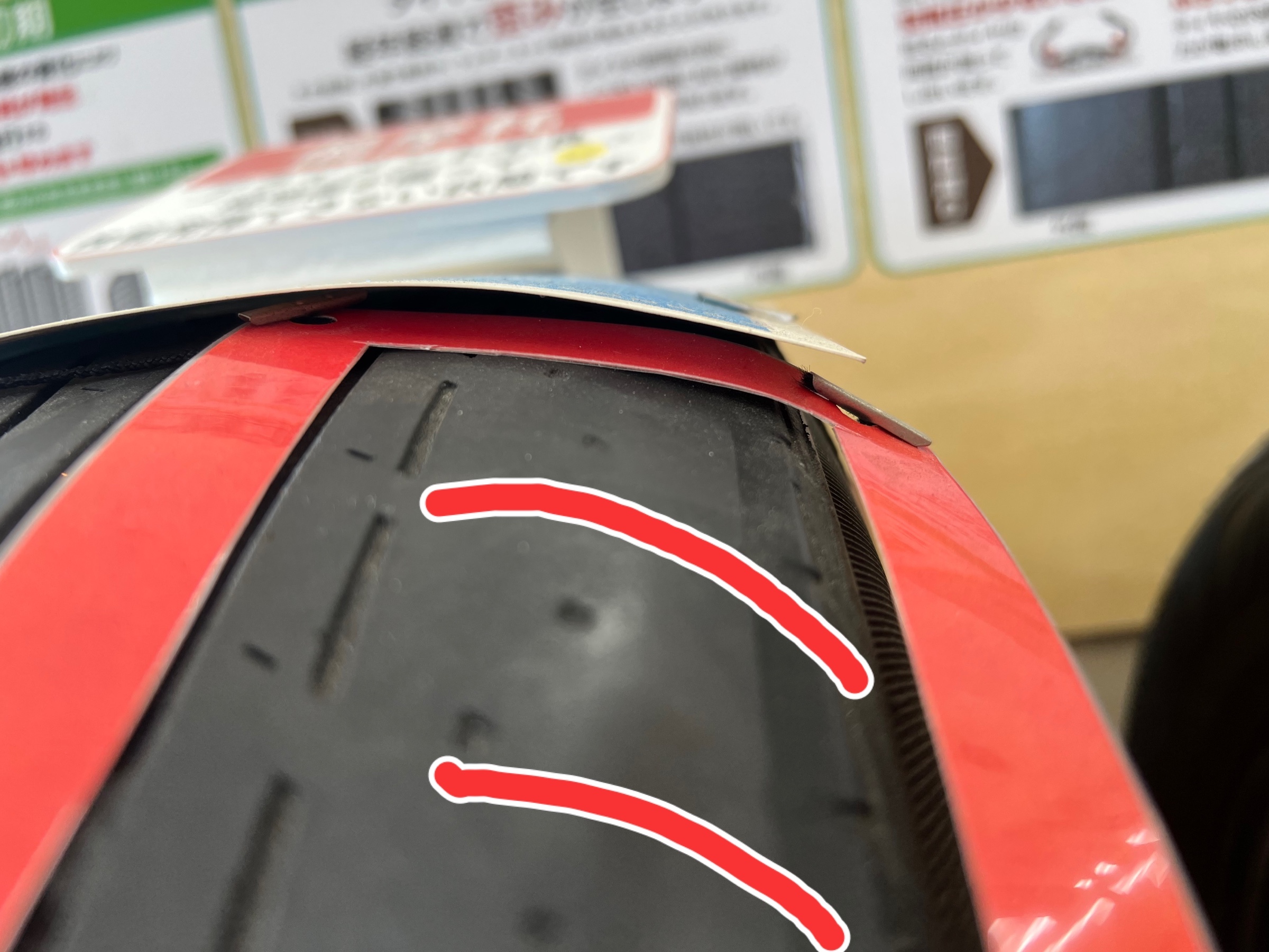 ↑このタイヤは肩の部分が丸く、つるつるになってしまっています。