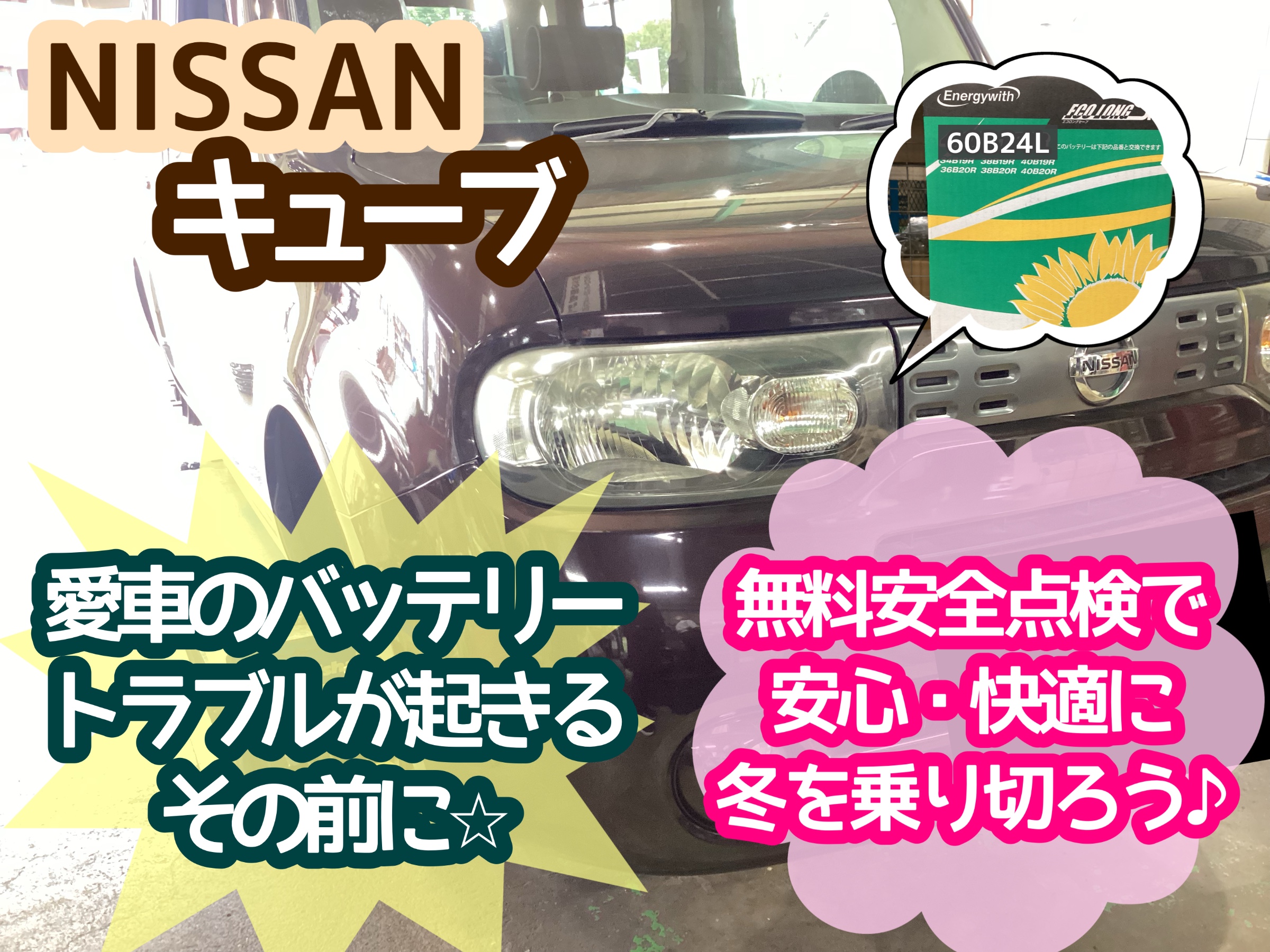 【NISSAN キューブ】愛車のバッテリーは大丈夫?トラブルを未然に★無料安全点検はいかが?