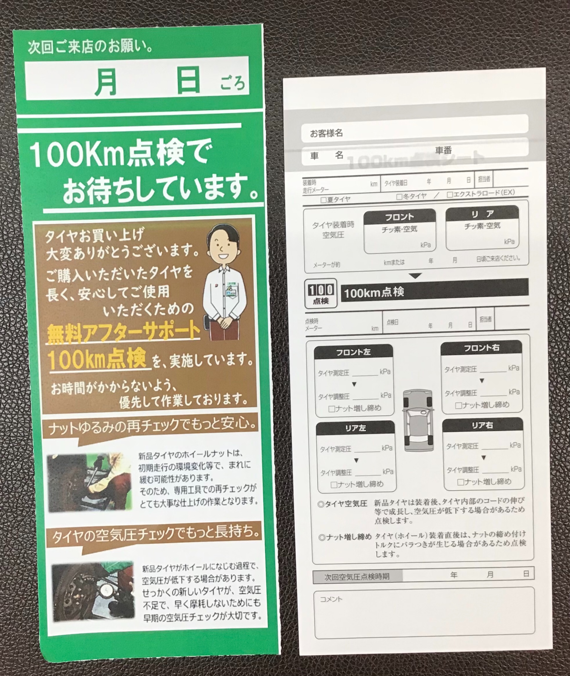 タイヤ館では、新品タイヤ購入後【 100㌔点検 】を