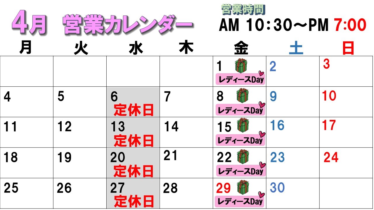4月の営業予定表とイベントのお知らせ☆彡