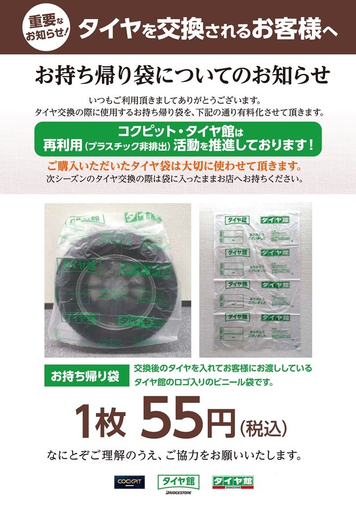 タイヤ持ち帰り袋 有料化のお知らせ ポスト 2022年6月30日 いつもタイヤ館木津をご愛顧いただき 誠にありがとうございます。 タイヤ交換をご利用いただいているお客様に大切なおしらせです。 2022年7月1日よりプラスチック資源循環促進法に基づき タイヤ持ち帰り袋が有料化となります。 ご利用いただいているお客様にはご迷惑をおかけしますが、 なにとぞご理解とご協力をお願い致します。 ※緑色袋・青色袋共に有料化となります。 カテゴリ:お知らせ