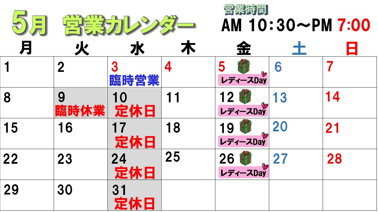5月の臨時休業のお知らせです。