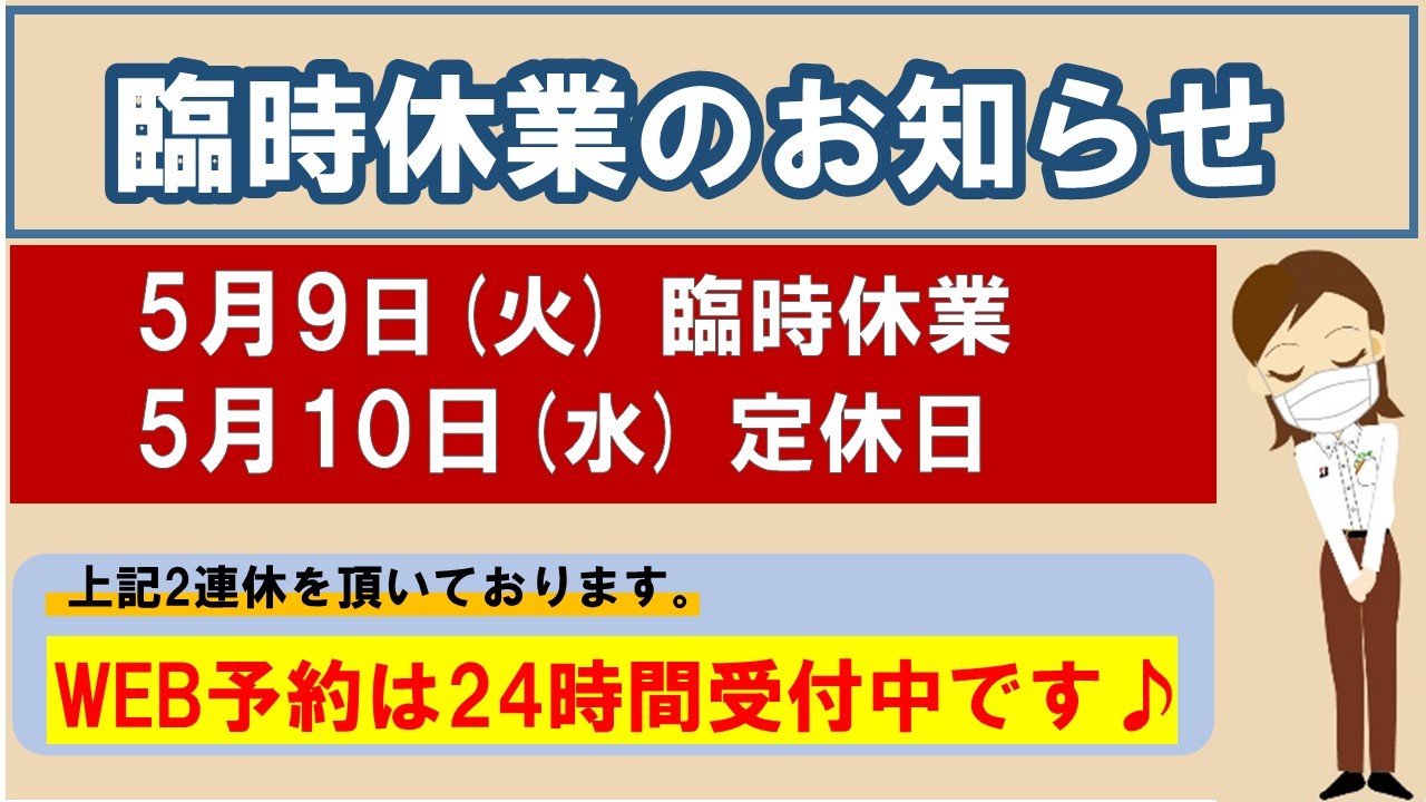 明日5/9(火)の臨時休業に加えまして