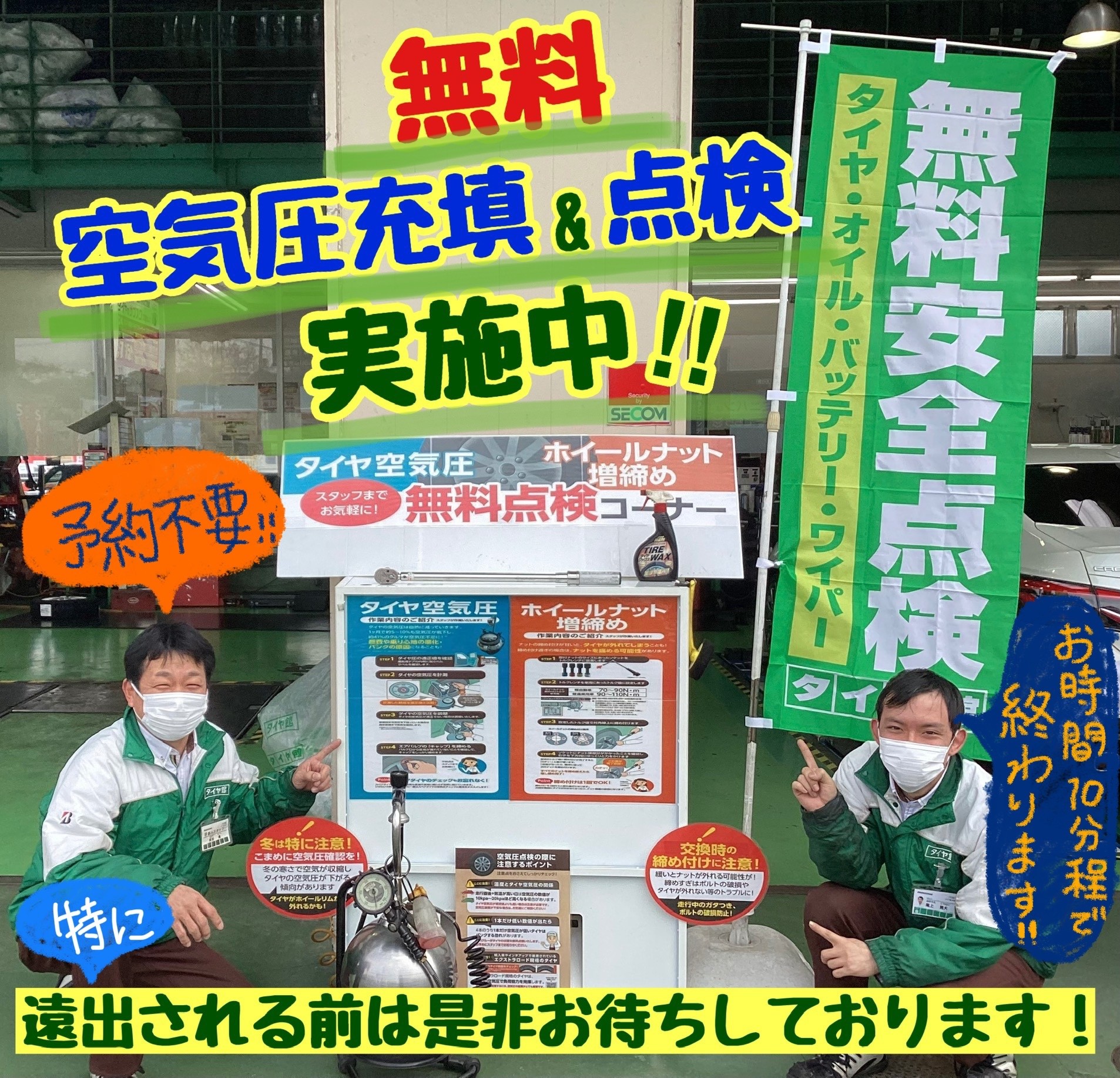 遠出前は必ずタイヤ、お車の無料点検を
