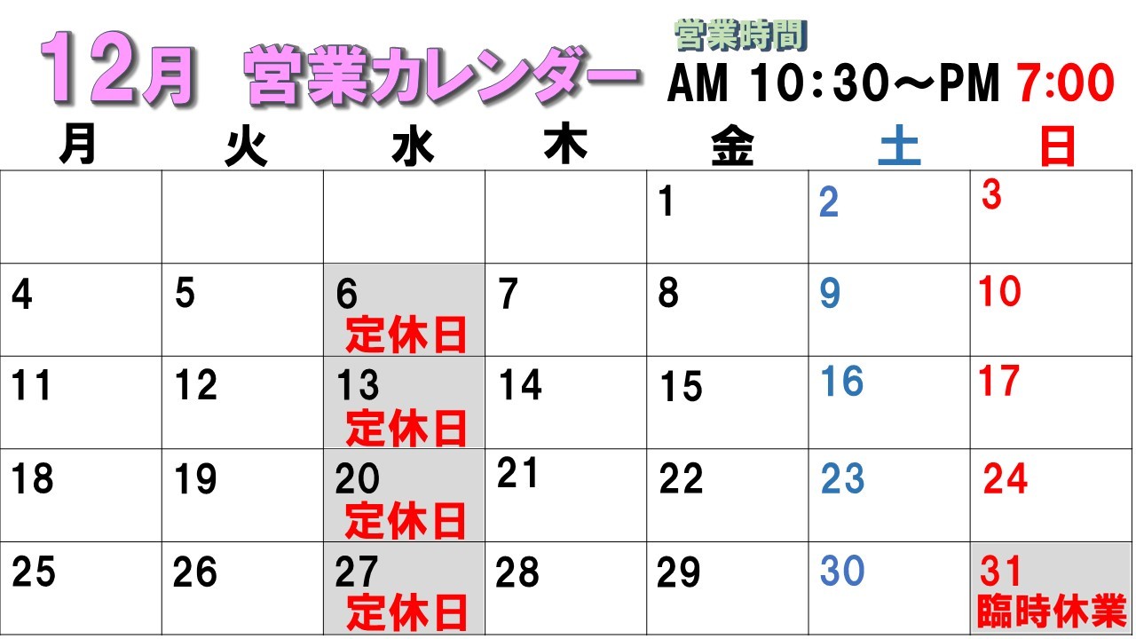 ◎ 12月定休日のお知らせ ◎
