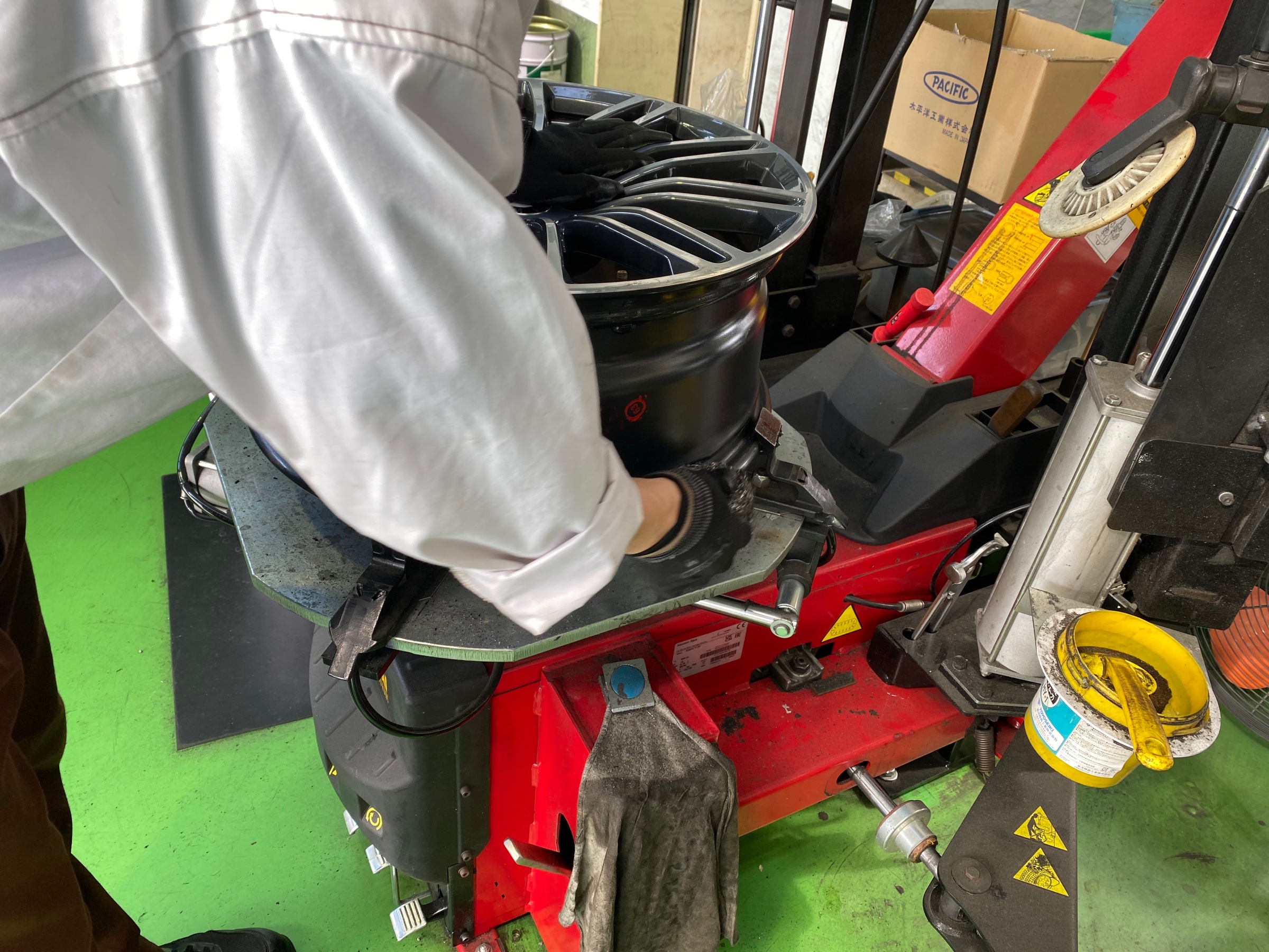 磨き終わったら、新品のタイヤをホイールに組み込んでいきます!