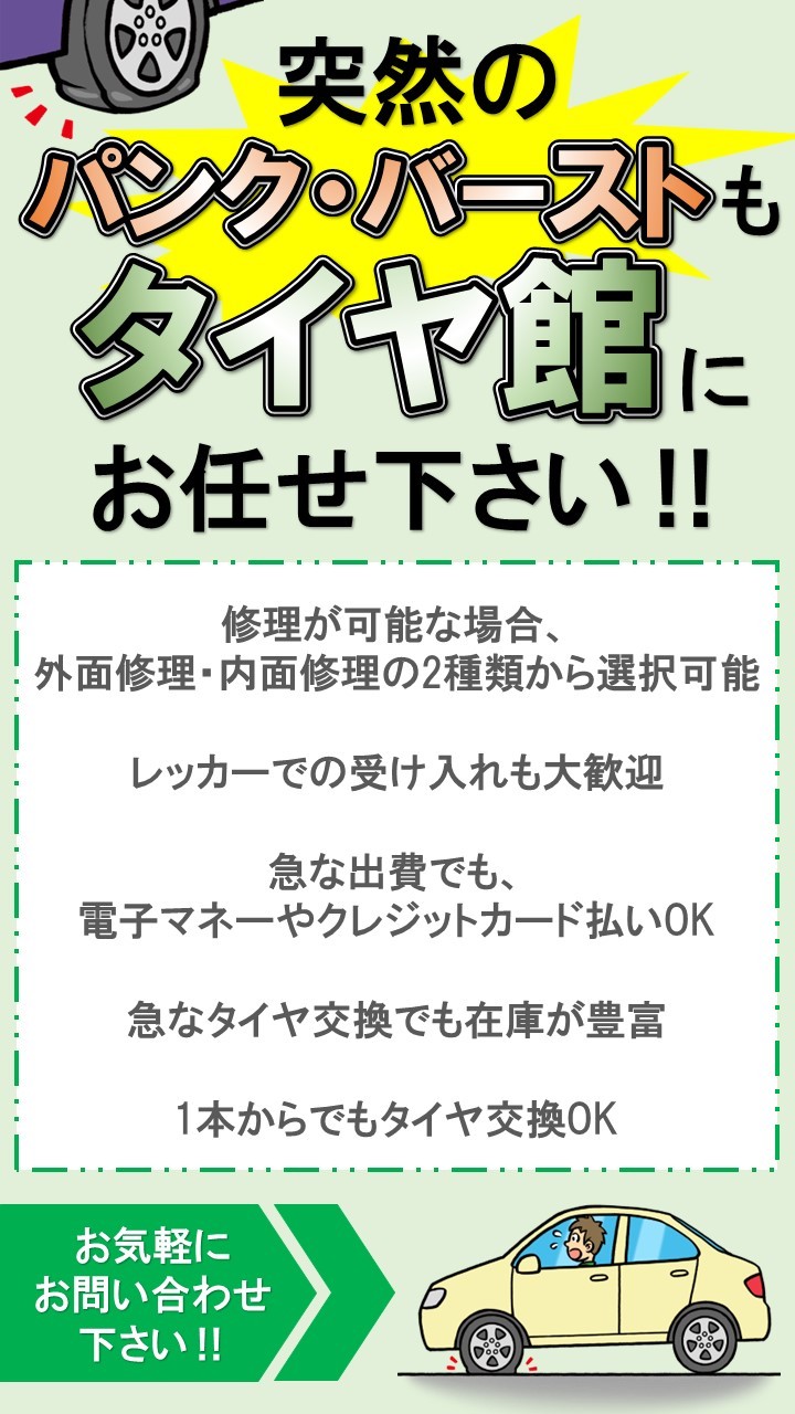 困った時はタイヤ館にお任せ下さい! ポスト 2024年5月18日 最近パンクでの来店が増えています。 出先でパンクやバーストした時、 どうしたら良いか分からず困惑しますよね…。 困った時はいつでもお気軽にタイヤ館へお問い合わせ下さい! 今後の対応をしっかりとサポートさせて頂きます! ご来店された当日でも、 パンク修理が可能であれば修理での対応、 タイヤ交換の場合、1本交換からでも作業可能です! カテゴリ:お知らせ