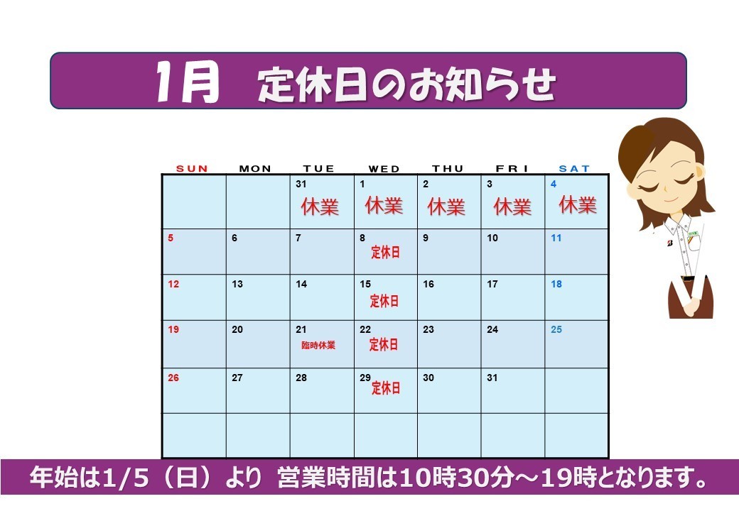 1月定休日及び臨時休業日のお知らせ