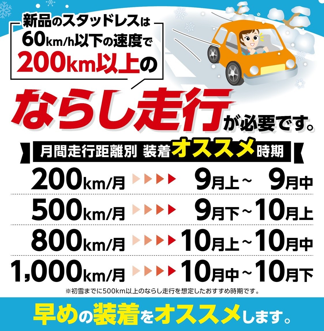 新品タイヤを装着する場合慣らし走行も必要となりますので、