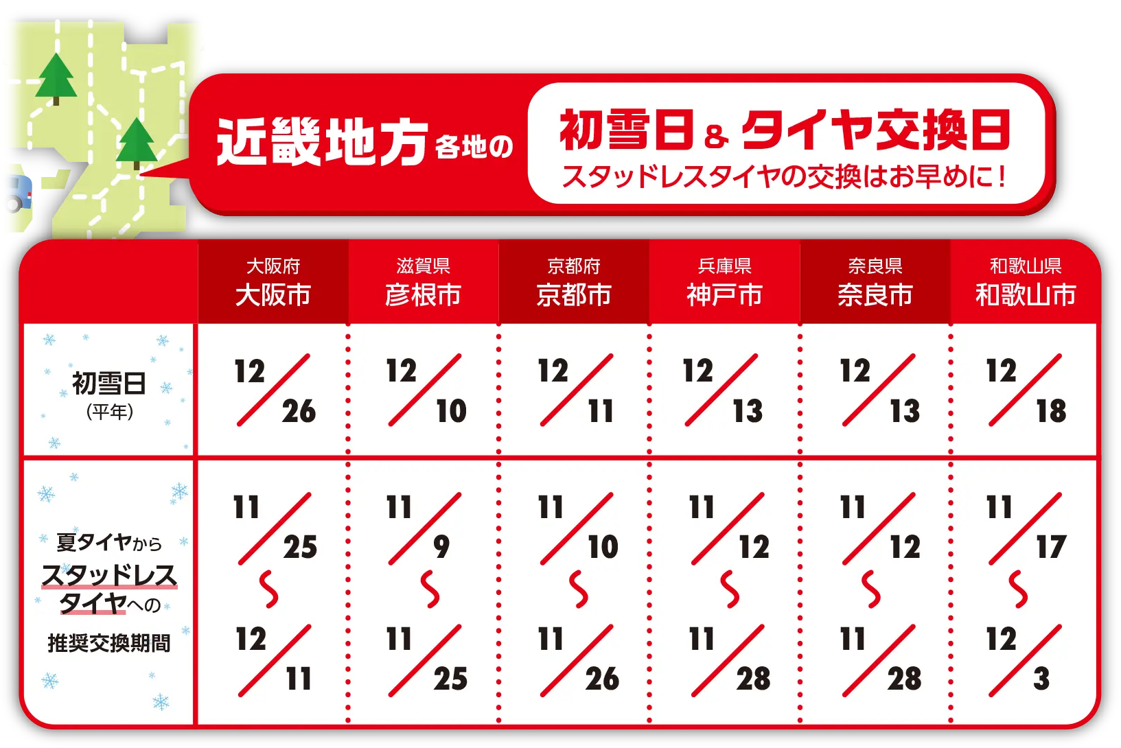 お住まいの地域の初雪日・タイヤ交換日の目安をチェックして、