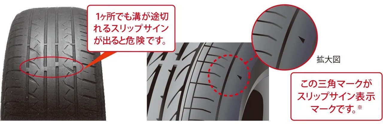 1箇所でもスリップサインが出たタイヤは、装着・走行してはいけないと法律で定められています。